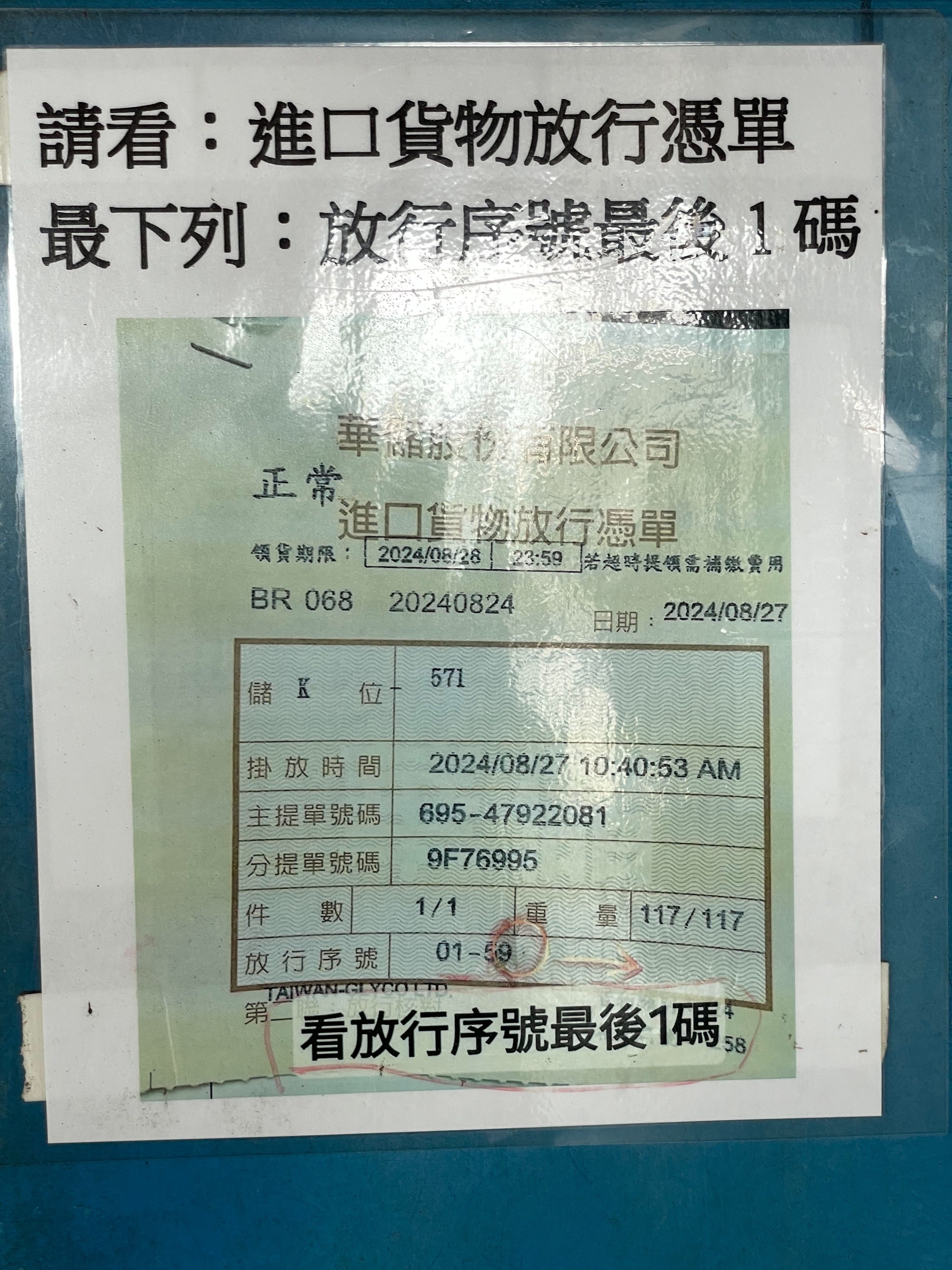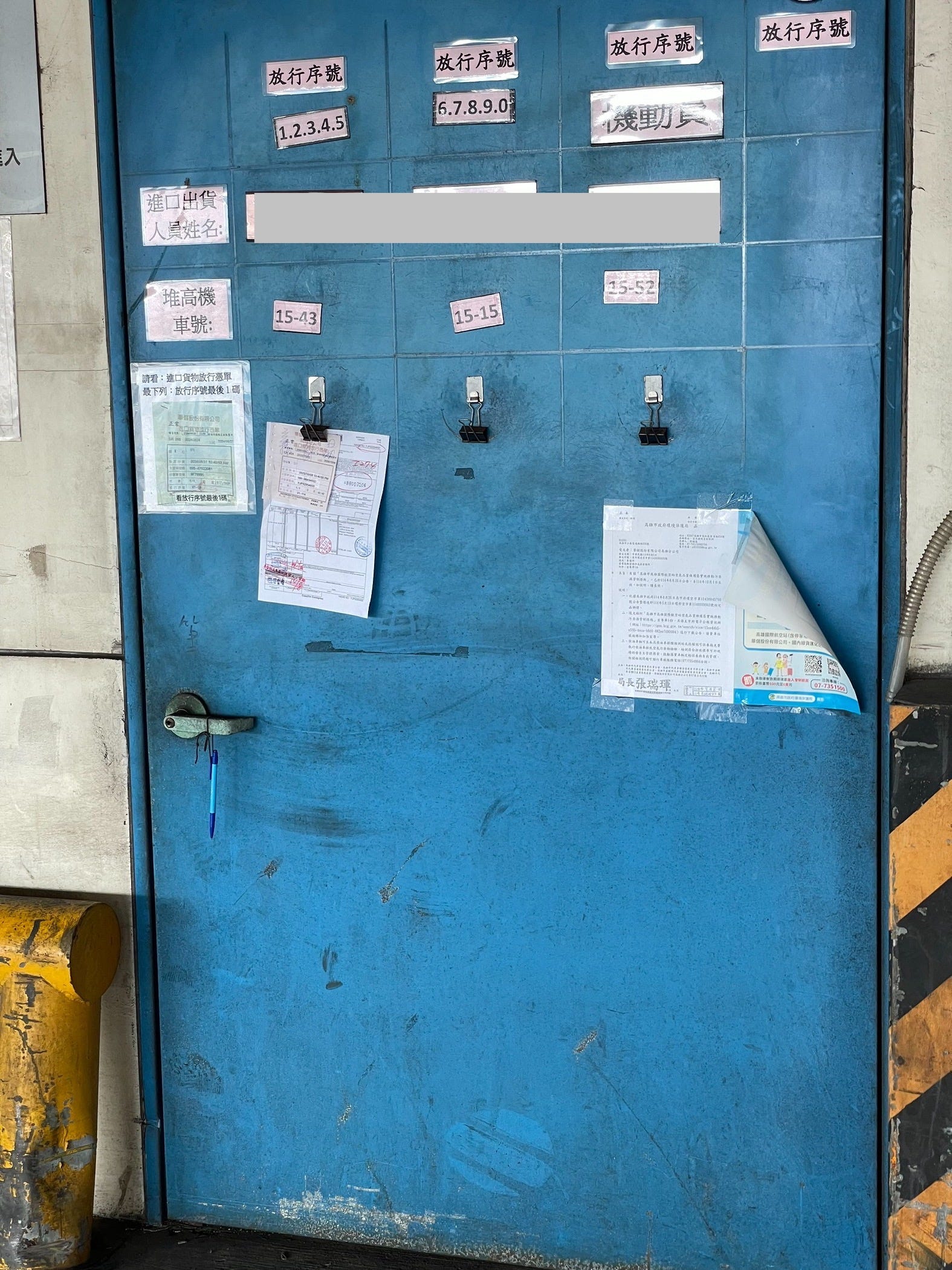 1.在華儲提貨區,藍色鐵門上貼「放行序號 1~9」等標籤。