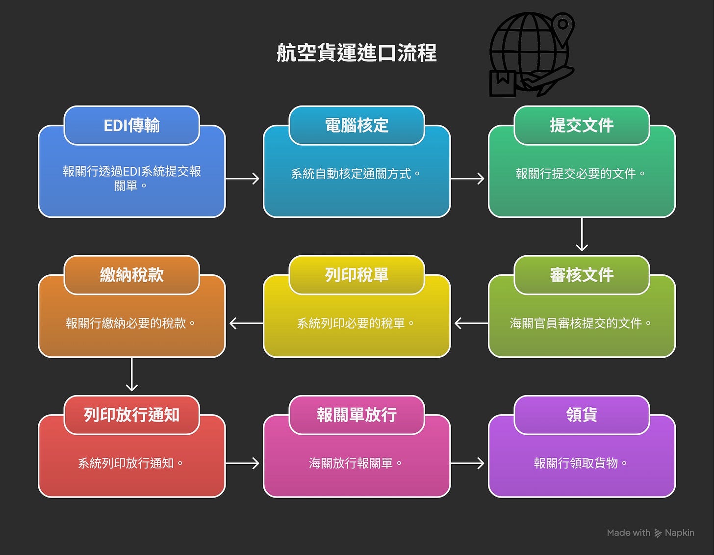 ✅ 通關流程:EDI 傳輸 → 核定 → 審核 → 放行 → 領貨。